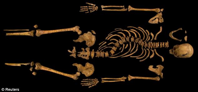 Dr Jo Appleby at the University of Leicester, said: 'Despite Richard's noble background, it appears that his lifestyle did not protect him from intestinal parasite infection, which would have been very common at the time.' The skeleton of Richard III, which was discovered at the Grey Friars excavation site in Leicester, is pictured