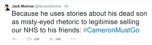 Father: It has emerged that Jack Monroe had attacked David Cameron (pictured with his son, Ivan) on Twitter for using ‘stories about his dead son as misty-eyed rhetoric to legitimise selling the NHS to his friends’