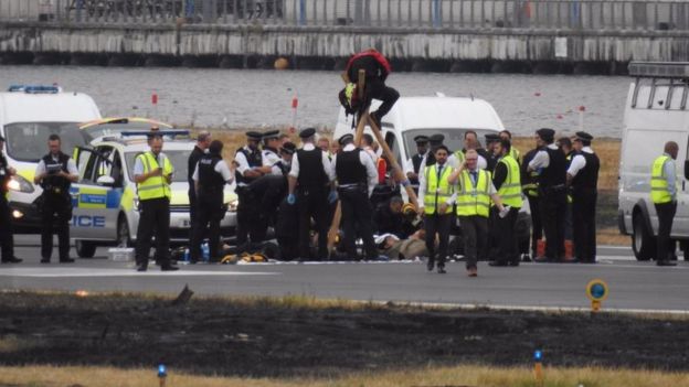 Scotland Yard said it was investigating how the protesters got on the runway - including the suggestion that they swam across the Thames or used a boat.