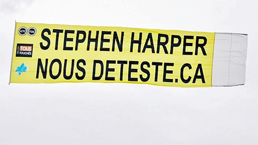 The banner, which was in French, read "Stephen Harper nous déteste.ca" (translated as "Stephen Harper hates us.ca" in English).
