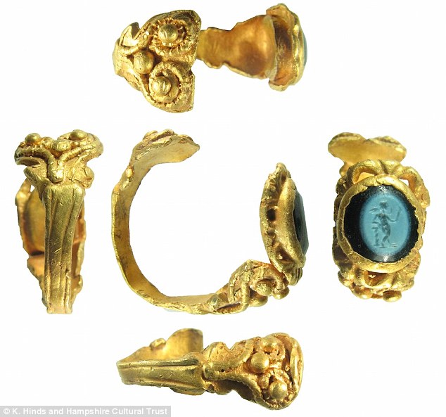An amateur metal detectorist in the UK has made an extraordinary find - a gold-carved ring (pictured from various angles) depicting Cupid, god of erotic love. The ring contains a dark onyx and blue engraved nicolo stone, and may once have rested on the finger of a man or woman during the reign of the Roman Empire
