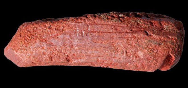 The ochre - a pigment made from clay and sand - pebble has a heavily striated surface that is likely to have been scraped to produce a red pigment powder.