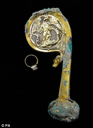 Close up: The gilded silver ring found in the grave and a silver and gilt crozier - a senior abbot's staff of office
