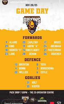 First up, the line-up changes from Friday for the Bisons were: Kieper replaced Holt as starting goaltender, Turner for Coyle on defence, and Dekay for Pasternak up front. I believe that Pasternak (the Friday night goal scorer) was injured. Joss was injured a couple weeks back. For the T-irds it was Schwebius for Mirwald in net, and Disher for Kotylak up front.