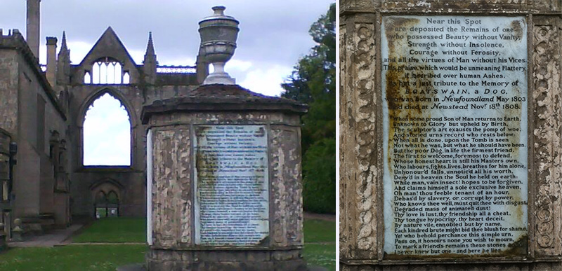 So devoted was Lord Byron to his Newfoundland, Boatswain, that when the dog died he erected a memorial (above, with 'Epitaph to a Dog' written by Byron himself inscribed on it) at his home at Newstead Abbey in Nottingham where he was buried. In 1808 Boatswain had been bitten in a nearby village and contracted rabies. Byron reported in his letters to have nursed him without realising what was afflicting his faithful companion.