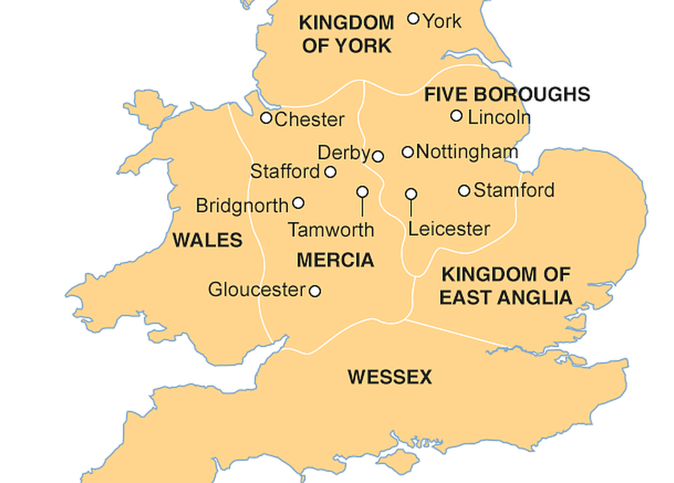 Mercia had once covered the Midlands, but was split, north to south, by Viking conquests.
