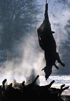 Rotting heaps of carcasses built up and the stench of burning flesh hung over pyres of animals.