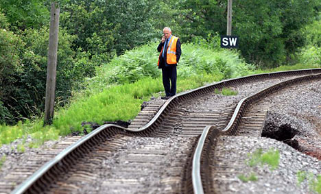 Severn Valley Railway's John Leach looks at the damage caused by overnight flash floods to rail lines outside the village of Highley, Shropshire