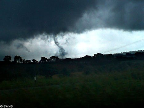 In Cornwall a mini tornado was spotted spinning across the summer skies and was captured on camera by startled motorist David Rogers, 25, over the A30 in Lostwithiel.