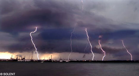 Lightning strikes dramatically over the Fawley Oil Refinery in Hampshire