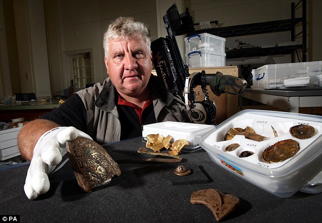 Terry Herbert with a helmet cheek plate, one of more than 1,500 pieces which made up a Anglo-Saxon hoard he found in a field in Staffordshire in 2009