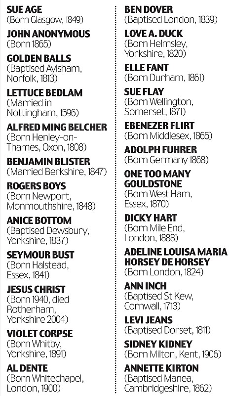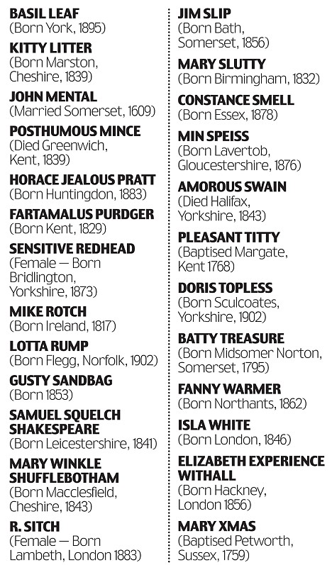 The Daily Mail's Russell Ash has also done his own research to discover as many British people as possible throughout the ages who were given daft names.