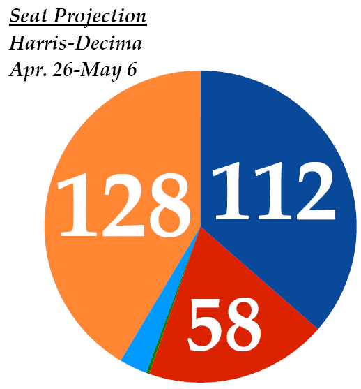 With Harris-Decima's numbers, the New Democrats would win 128 seats, with the Conservatives winning 112 and the Liberals 58. The Bloc Québécois would win nine seats and the Greens one.