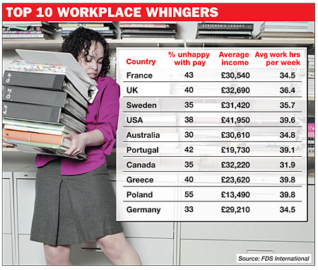 On the subject of wages and working hours, British employees come second only to the French in terms of unhappiness.