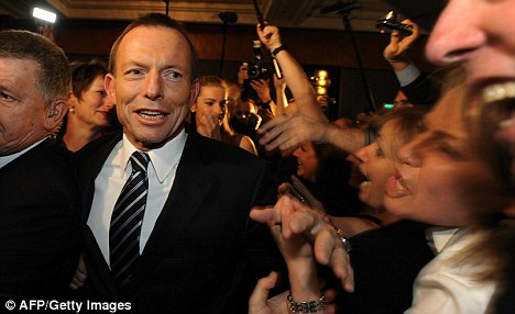 So close: London-born and Oxford University-educated Opposition leader Tony Abbott is cheered by the party faithful as he arrives at a function last night