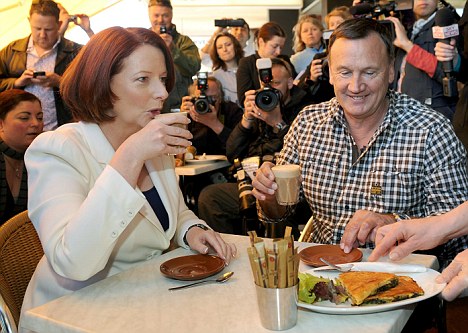 The morning after: Australian Prime Minister Julia Gillard, born in Barry, south Wales, and her partner Tim Mathieson take time out for breakfast after yesterday's inconclusive result