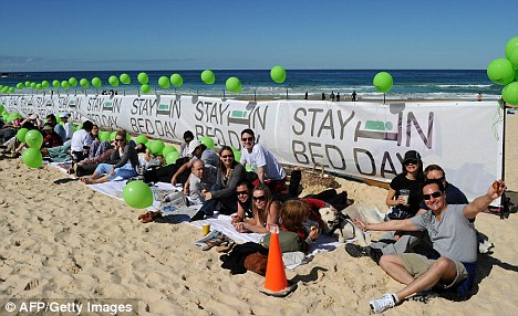 Long night: Sydney residents exhausted from staying up late waiting for the election results snuggle together on a 50-metre wide 'bed' to increase public awareness of mitochondrial disease. The weather was warm and sunny, despite this being the middle of Australia's winter.