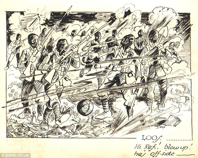 Come on, ref! He's way offside!: A comic cartoon depicting the men of the London Irish Rifles booting their football towards the German Front Line
