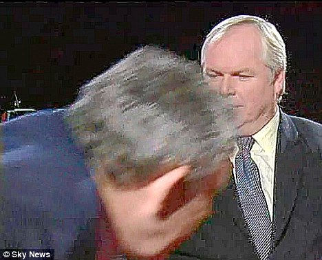 But his microphone tethers him to his seat as Adam Boulton looks on
