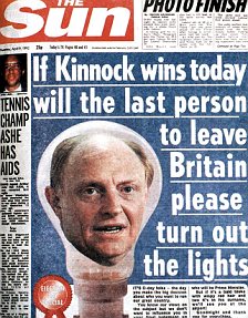 Switch: The Sun's front page yesterday (left) and the tabloid's famous front page on polling day in 1992 that it later claimed clinched another victory for the Tories