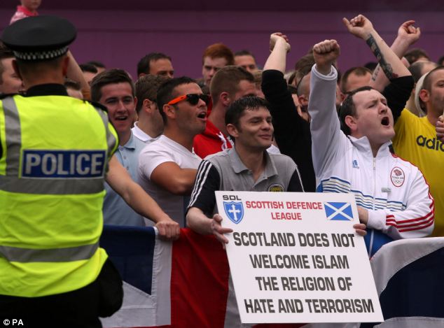 Thankfully, though, not everyone is Scotland are left-wing thugs, as shown by this demo outside the Scottish Parliament in Edinburgh by the SDL (Scottish Defence League):