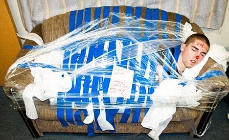 Stuck on you: This person's friends decided to make this sofa his new home