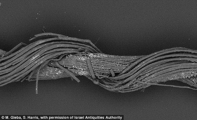 Textiles analysed as part of the new study, led by the University of Cambridge, came from over 30 different sites in the UK, Spain, Italy, Greece, Turkey, Iraq and Egypt. Pictured is a a splice in one of the single thread elements of fabric found in the cave of the warrior, Israel