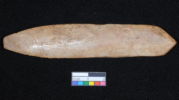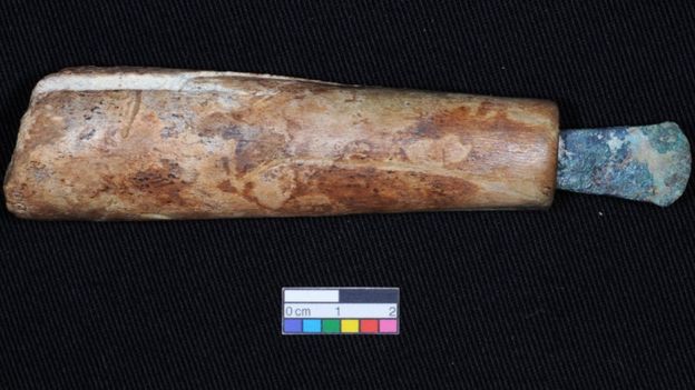 A copper chisel, which still has its decorated bone handle attached, was one of the objects unearthed