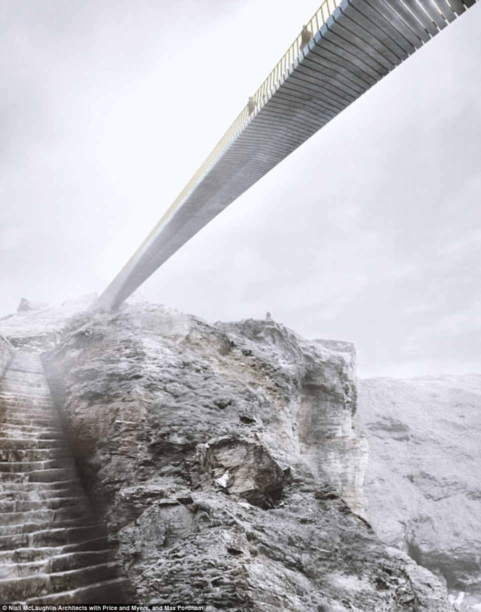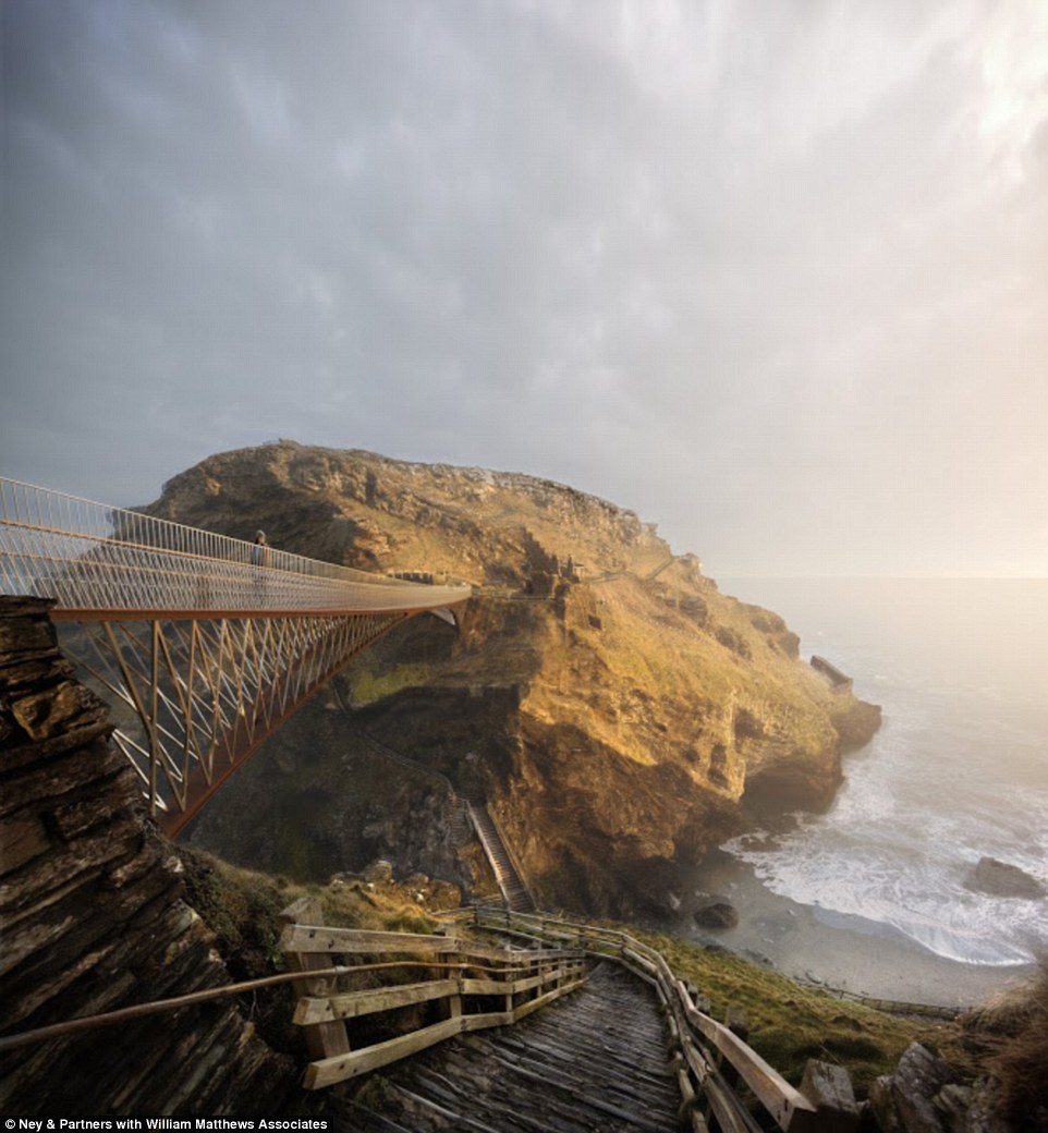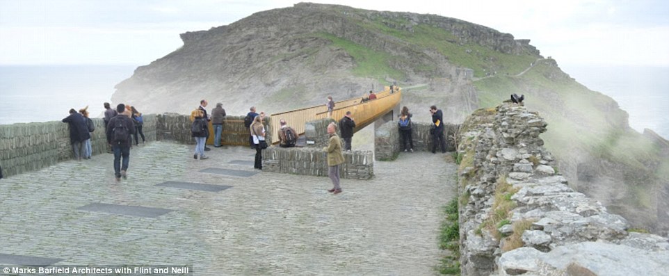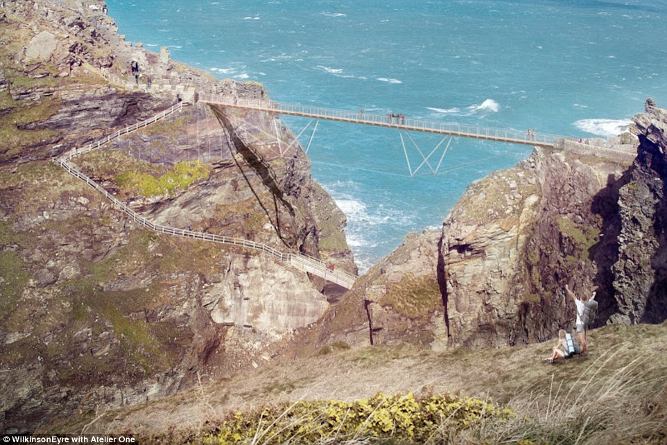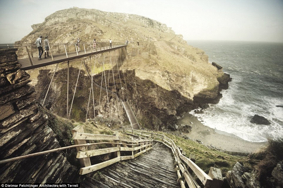 Bridging the gap: Six designs, including this one from RFR and Jean-Francois Blassel, have been submitted for a new footbridge at Tintagel Castle, which is visited by more than 200,000 people every year. The castle is a medieval fortification located on the peninsula of Tintagel Island