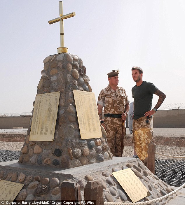 England star David Beckham, 35, who also plays for Los Angeles Galaxy but is currently on loan at AC Milan, stood with his head bowed at the Camp Bastion memorial for Britain's fallen troops as a Union flag flew at half-mast. He also took time to read the names of the fallen engraved on brass plaques.