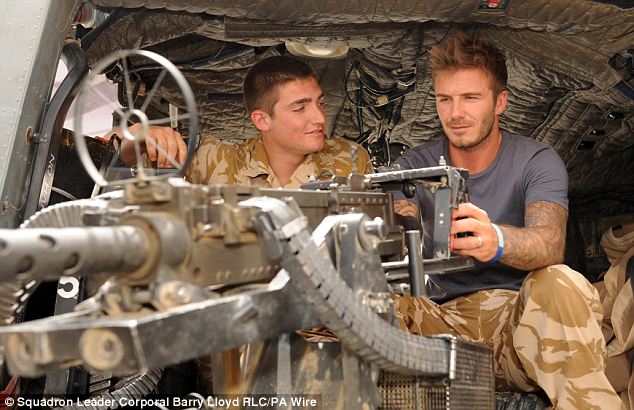David Beckham gets to grips with some of the military hardware during his visit to Camp Bastion where around 9,000 British soldiers are based