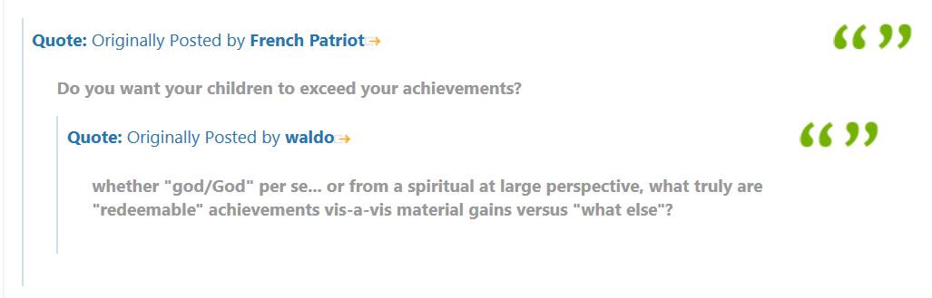Do you want your children to exceed your achievements?whether "god/God" per se... or from a spiritual at large perspective, what truly are "redeemable" achievements vis-a-vis material gains versus "what else"?