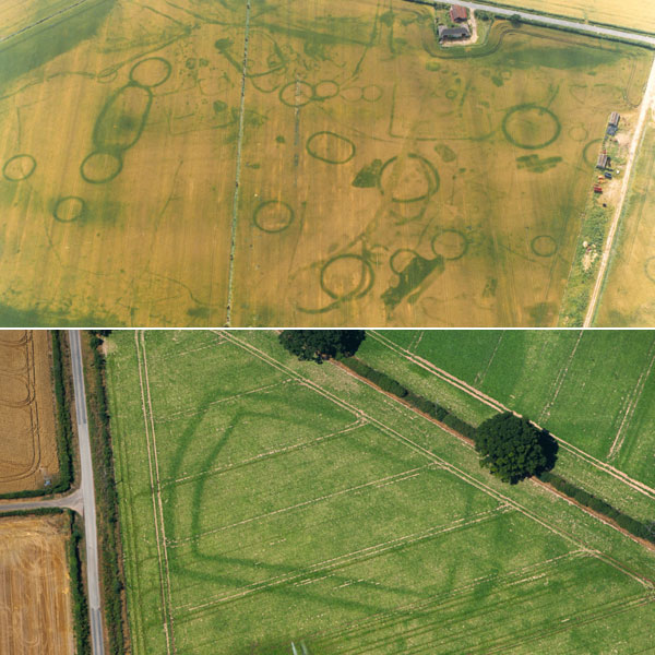 (TOP) Round borrows from the Bronze Age are seen in the Vale of Glamorgan. (BOTTOM) The outlines of a medieval ditch in Shropshire.