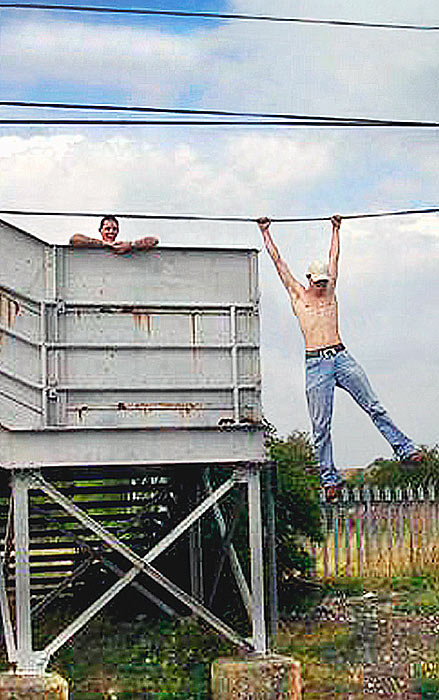 Bare-chested and fuelled by drunken bravado, he dangles from a 25,000 volt power cable.