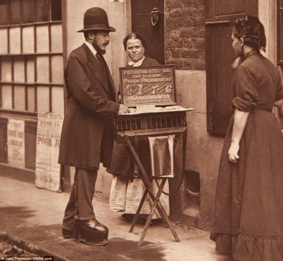 Cough sweets: A 'street doctor', wearing a corrective shoe and a large top hat, plies his wares on the streets with a sign reading 'Prevention Better Than Cure', with the treatment costing as little as a halfpenny