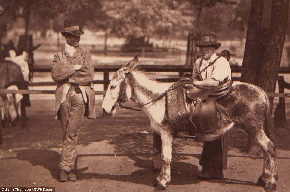 Included in the 36 photographs are images of men hiring donkeys out in Clapham and recruiting sergeants in Westminster.