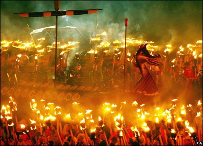 The ceremony takes place in Lerwick, far north in the Shetland Isles. Lerwick is the northernmost town in Britain. It is one of the first of the many eccentric ceremonies and rituals that take place throughout Britain each year. The others will include chasing after a cheese that's rolling down a hill, bog snorkelling, counting the number of swans on the Thames and burning an effigy of the Pope.
