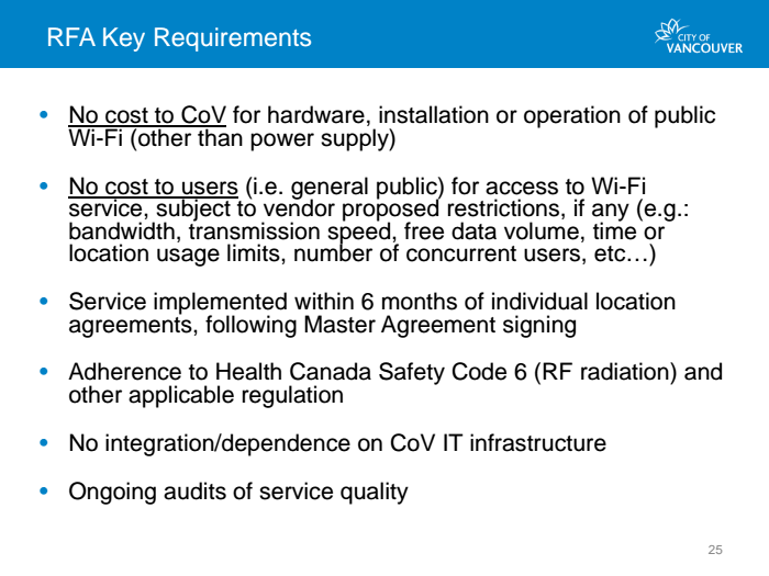 The city has awarded Telus a five-year contract to offer free public Wi-Fi at 43 locations around the city. The initial target locations include 27 community centres and other civic and cultural facilities.