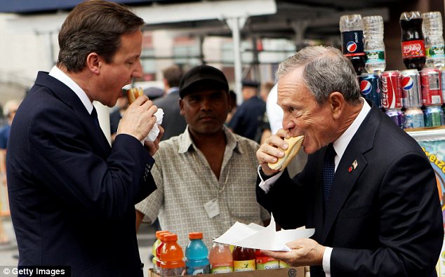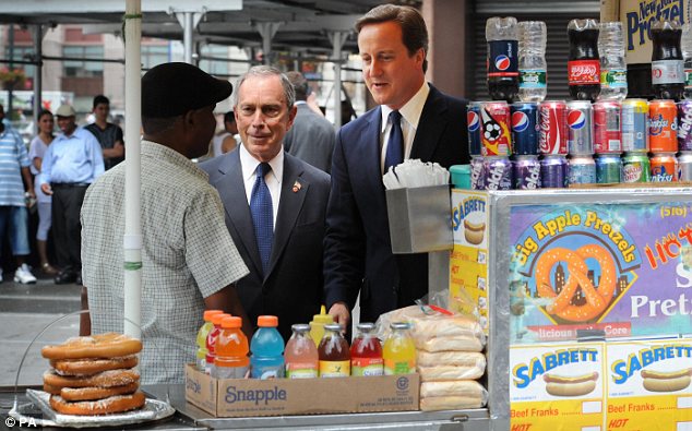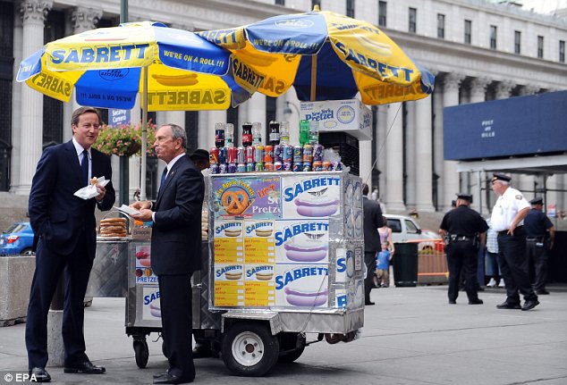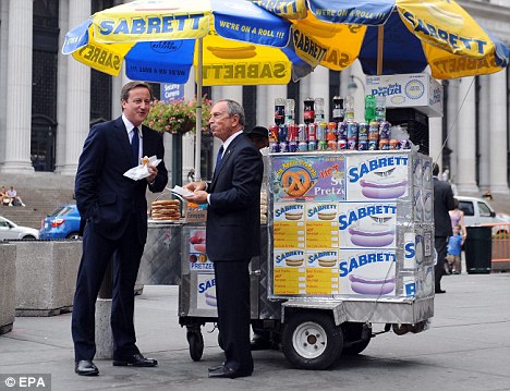 Snack time: David Cameron and New York City Mayor Michael Bloomberg stop for a snack