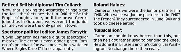 Former defence minister Kevan Jones told the Mail: 'David Cameron is guilty of talking down Britain and disrespecting Second World War veterans who know that Britain was fighting alone against Nazi tyranny while America was still putting its fighting boots on.'