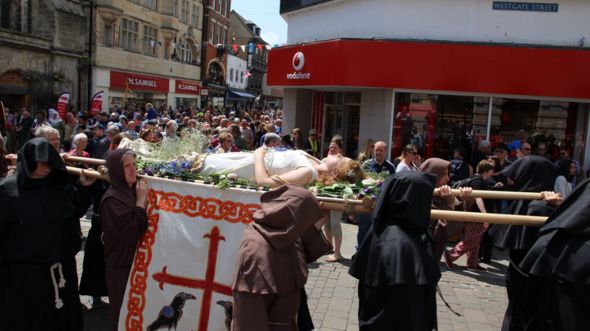Samantha Swinford as Queen Aethelflaed is carried through Gloucester city centre