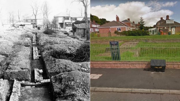 Barrack block of Benwell Fort, excavated in 1937, with the newly-built houses of Denhill Park in the background, and Denhill Park today