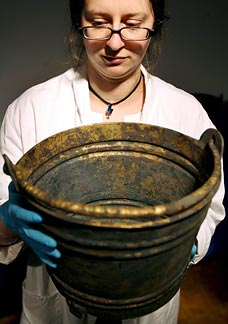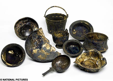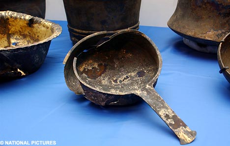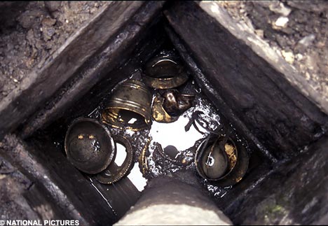 The collection of 19 vessels, found at the bottom of the 2.5 metre deep wood-lined well dating from AD380, includes wine buckets, a cauldron, a ladle and bowls.