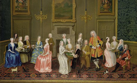 Courtiers having tea at Lord Harrington's house - Henrietta, sitting at the card table in a blue and yellow dress, has her head inclined towards the man near the fireplace, the love of her life George Berkeley