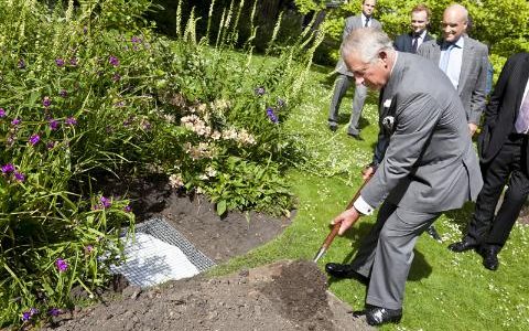 The Prince of Wales buries two sweaters, one made from wool and another from a synthetic fibre, to test their biodegradability