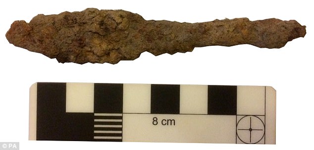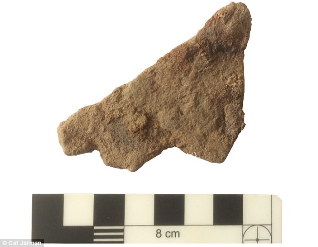 There were fragments of Saxon millstones and a cross fragment from the monastery, as well as broken pieces of weaponry including fragments of battle-axes and arrows. Pictured is a fragment of an arrow head