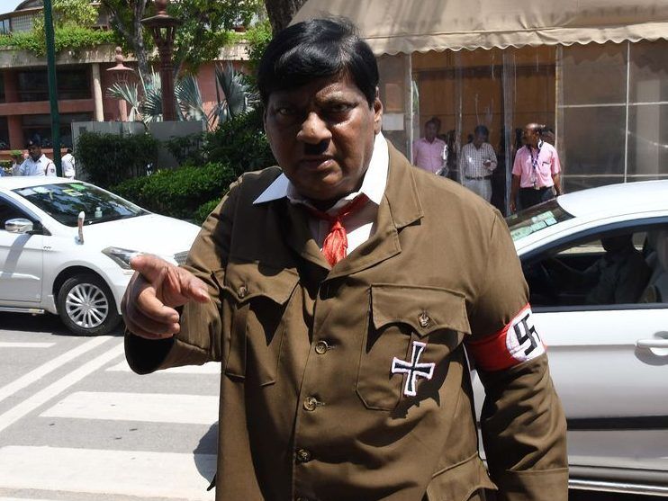 Indian film actor turned politician Naramalli Sivaprasad, arrives at parliament dressed as Adolf Hitler to press for government funding for his home state of Andhra Pradesh, in New Delhi on August 9, 2018. - Sivaprasad, 67, an icon for the low-caste Dalit community, often dresses up in outlandish costumes. In parts of Asia, Hitlers crimes are not common knowledge and he is even glorified in some places.- / AFP/Getty Images