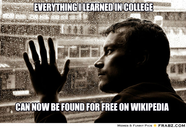 What's true is that the educational material and tools out there exist to help make delivery of education more efficient and at significantly lower costs. Of course Wikipedia is not a sufficient tool for educating a highly trained workforce. The point is that education can be made available to many people at a cheaper cost if we use a different educational model.