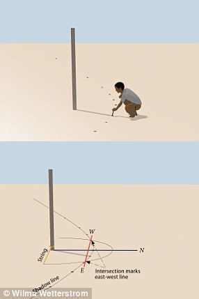 The Indian circle method allows you to draw a line running east-west (red) with just a pole and the sun's shadow (top)