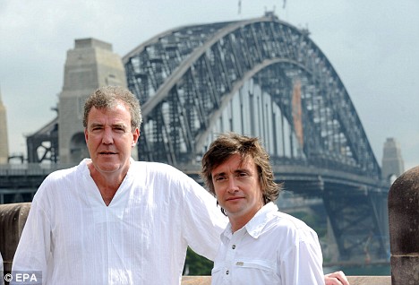 Mouthing off: Top Gear hosts Jeremy Clarkson and Richard Hammond pose for photographs in front of the Sydney Harbour Bridge
